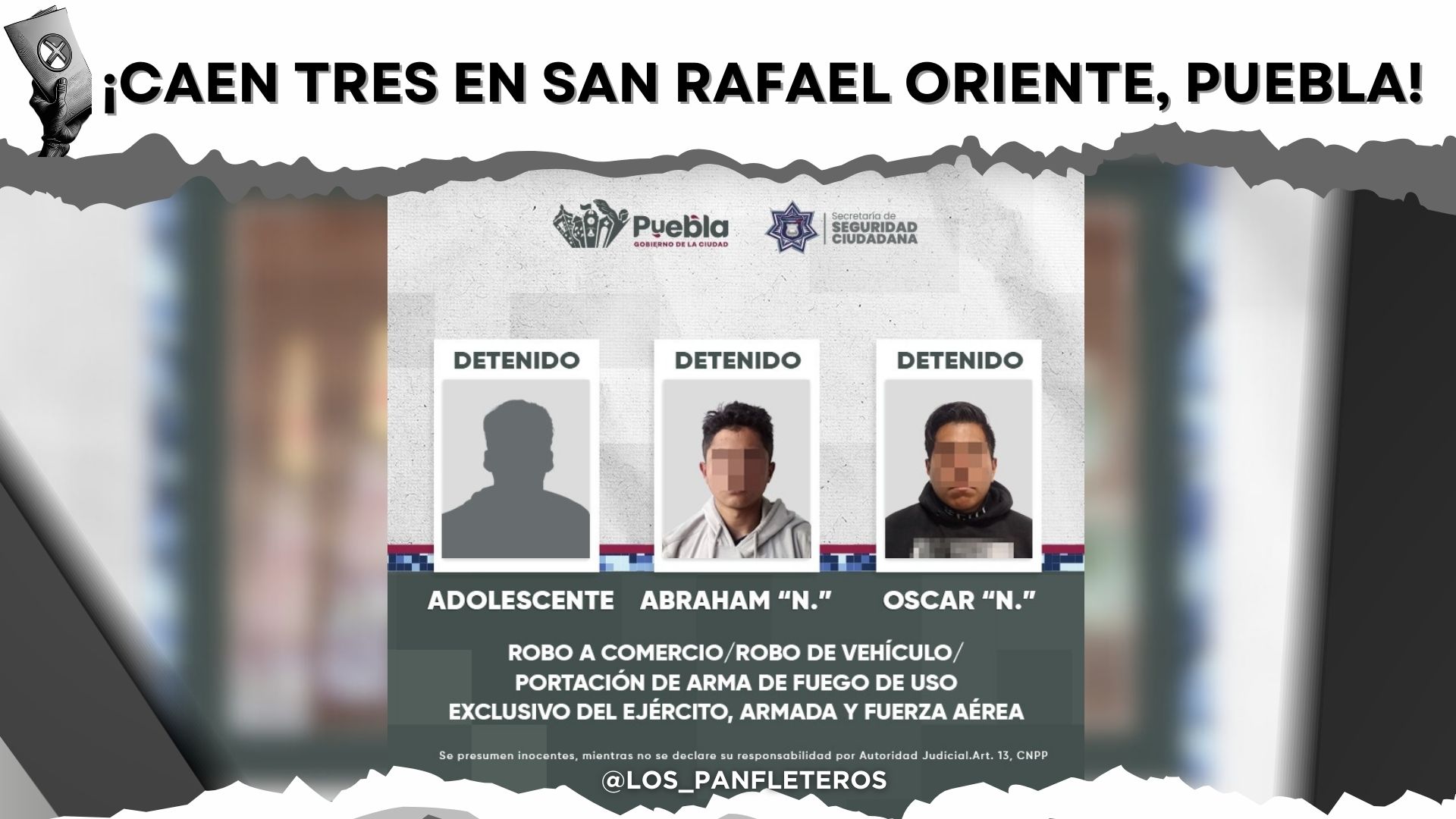 La tira poblana persiguió y atoró a Óscar “N”, Abraham “N” y a un menor, señalados por robo a comercio y por tumbar un carro con lujo de violencia.